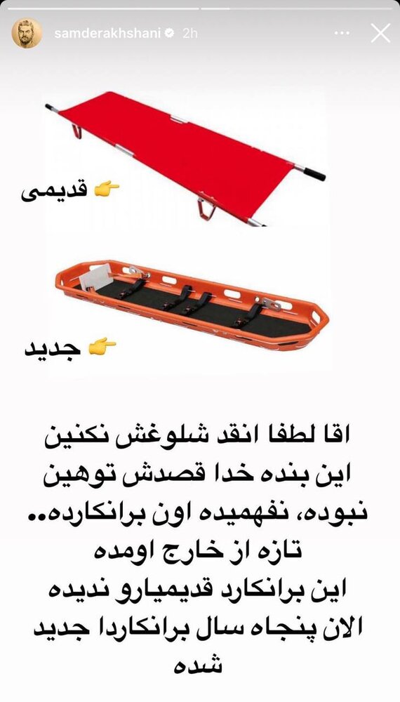 به گزارش خبرگزاری خبرآنلاین؛ سام درخشانی بازیگر خوش اخلاق سینما و تلوزیون به حواشی بازی روز پنج شنبه استقلال و ملوان واکنش نشان داد و با انتشار استوری در صفحه اینستاگرامش قدیمی بودن برانکاردهای لیگ ایران را دلیل اشتباه محاسباتی ساپینتو اعلام کرد؛